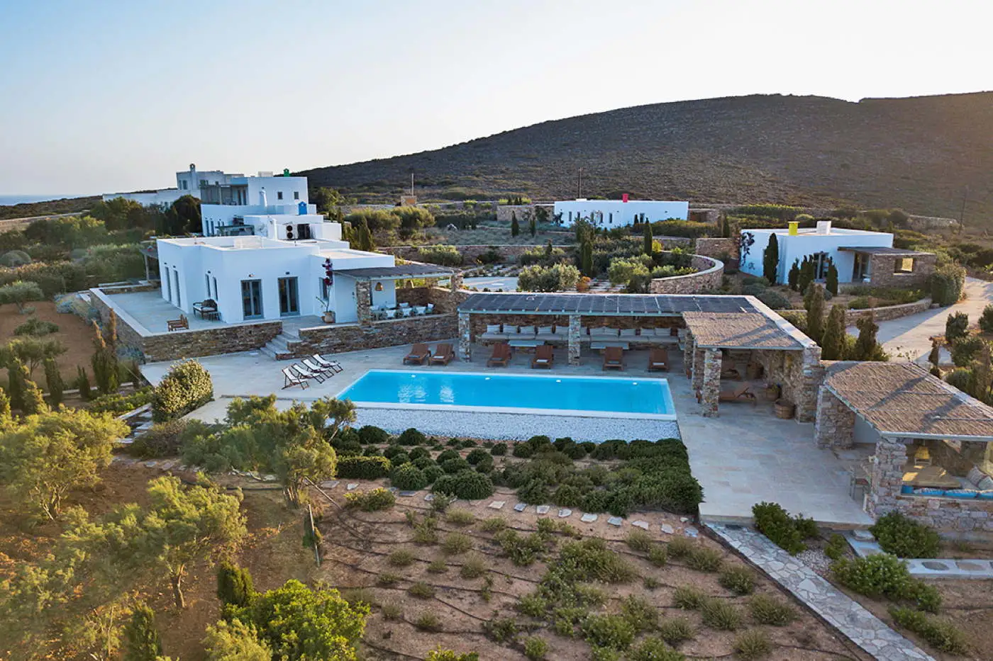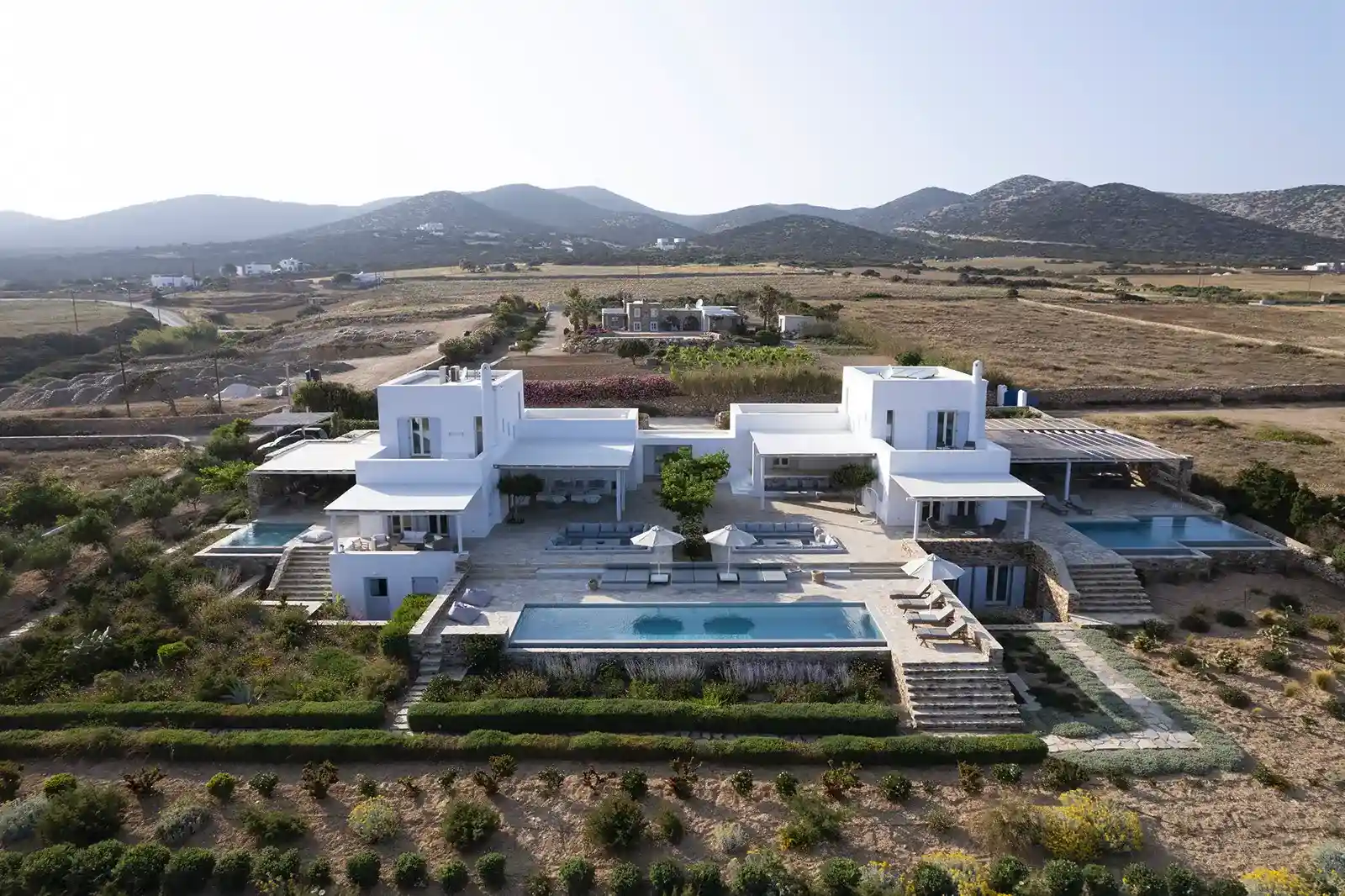 Also situated in Antiparos, Villa Irma offers nine bedrooms, vast living pavilions, and a private pool surrounded by Mediterranean gardens. The architecture favors natural ventilation and shaded terraces, perfect for afternoon gatherings or quiet reading corners.
