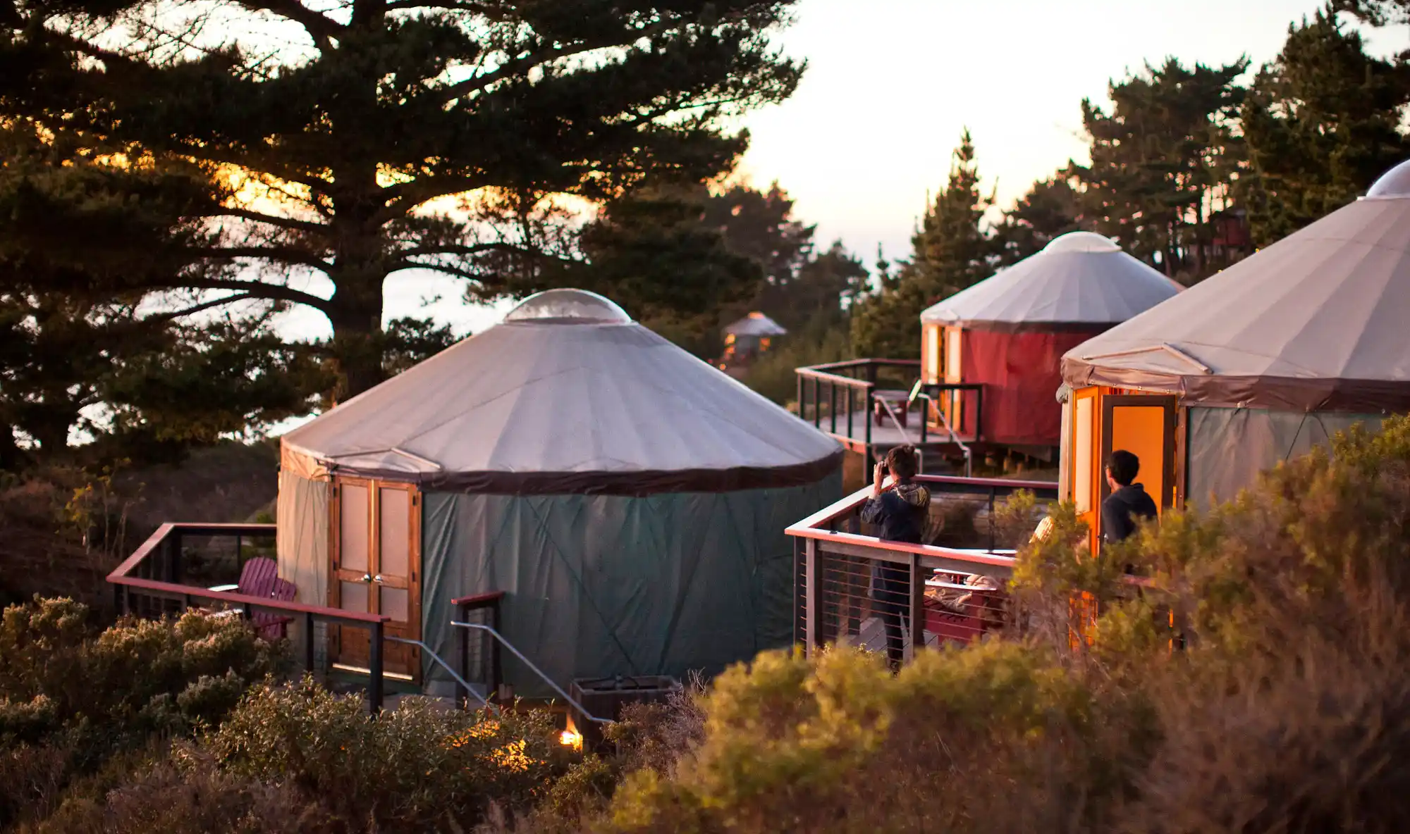 Treebones offers glamping-style yurts and self-sufficient tents powered by solar. It integrates strongly with nature, offering off-grid luxury along the California coast.